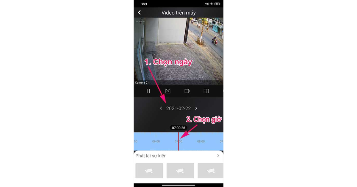Chọn ngày và giờ bạn cần. Thanh thời gian sẽ hiển thị các đoạn video đã lưu trữ. Nhấn vào để xem.