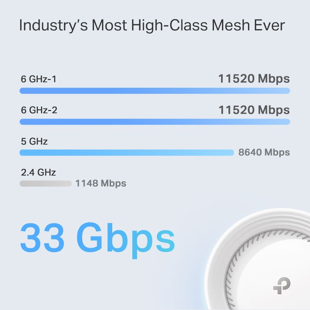 | WiFi Range | Broader Whole Home Coverage TP-Link Mesh Technology Optional Ethernet backhaul work together to link Deco units to provide seamless coverage AI-Driven Mesh Intelligently learns the network environment to provide ideal Wi-Fi unique to your home 12× High-Gain Antennas (Internal) Multiple antennas form a signal-boosting array to cover more directions and large areas Quad-Band The greenfield 6 GHz band brings more bandwidth and faster speeds |