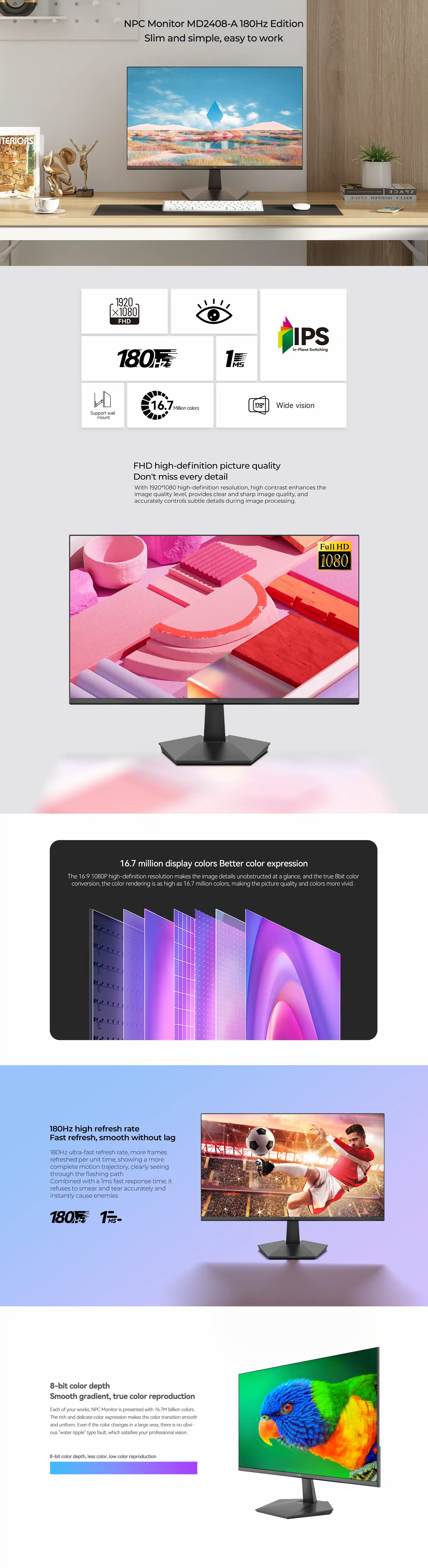 Màn hình văn phòng NPC MD2408-A IPS Full HD 180Hz độ phủ màu 97% sRGB
